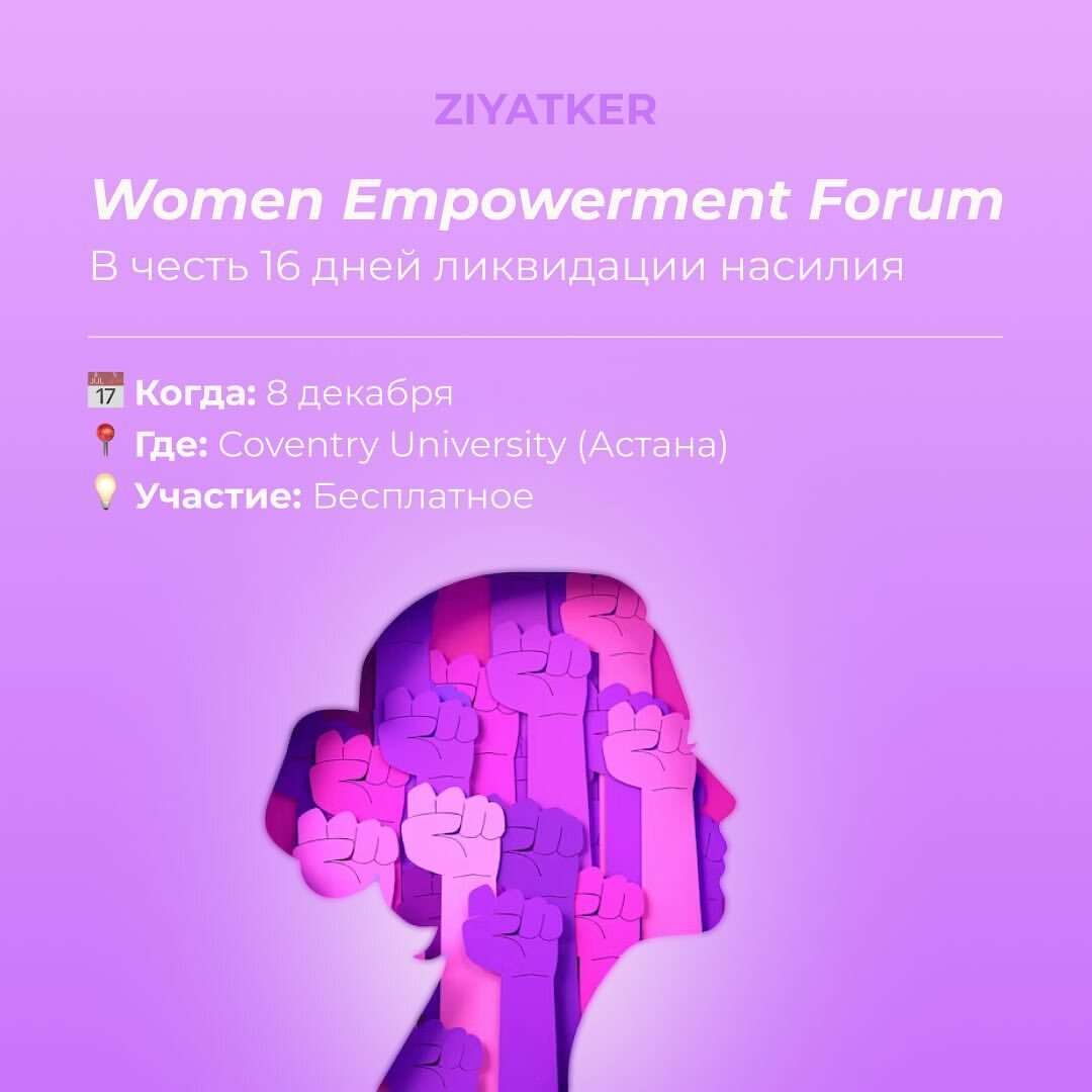 Форум «16 дней ликвидации насилия в сторону женщин», организованный инициативой «Ziyatker» при АОО НИШ совместно с UN Women Kazakhstan, состоится 8 декабря в Coventry University, Астана. Мероприятие объединит около 100 женщин со всего Казахстана для обсуждения и борьбы с насилием и гендерным неравенством.